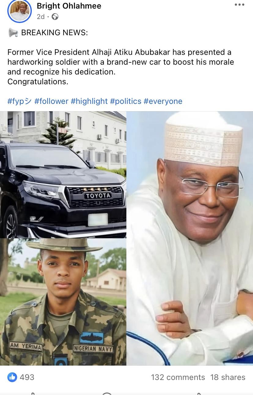 The claim, first shared by Bright Ohlahmee, a Facebook user with 26k followers read: “BREAKING NEWS: Former Vice President Alhaji Atiku Abubakar has presented a hardworking soldier with a brand-new car to boost his morale and recognize his dedication. Congratulations.“