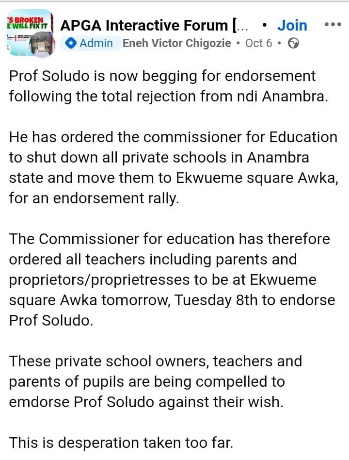 The information was posted on Facebook by one Christian Obi under the APGA Interactive Forum, a page on Facebook that has more than 84k members.