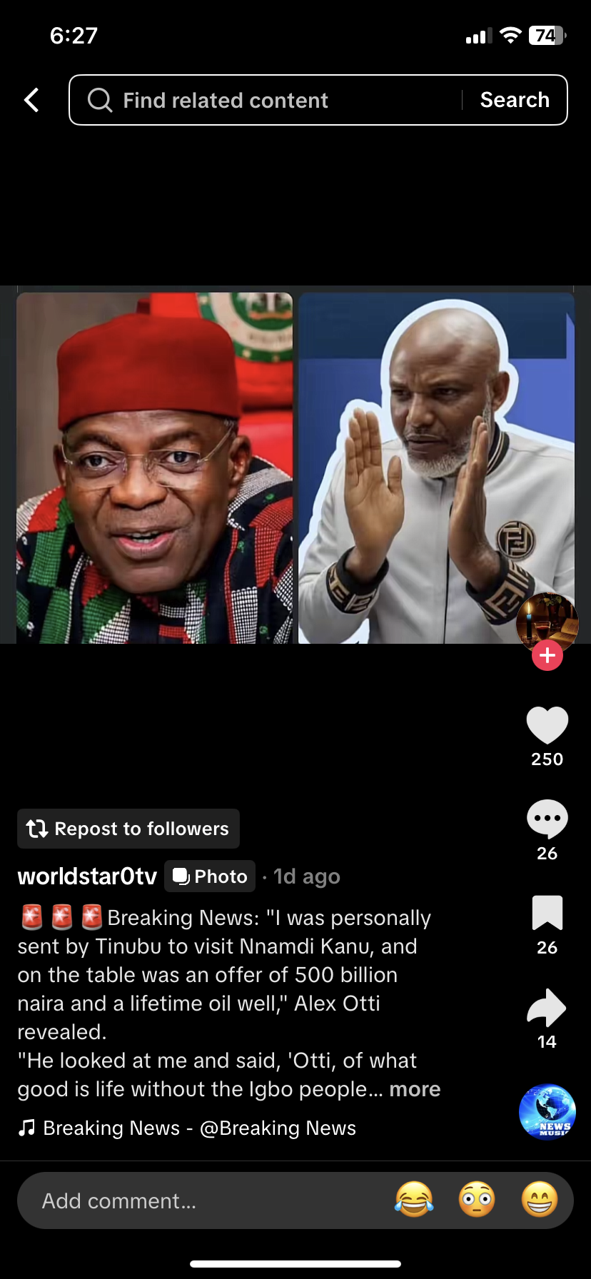 The post, shared on TikTok by Worldstar0tv, a user with 2,541 followers read: “Breaking News: “I was personally sent by Tinubu to visit Nnamdi Kanu, and on the table was an offer of 500 billion naira and a lifetime oil well,” Alex Otti revealed.
